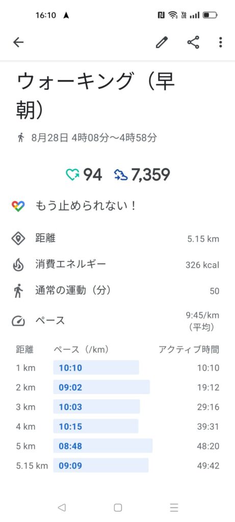 上記はGoogleFitでみたある日の記録です。私は毎朝6時過ぎには仕事に出かけるので、5時までには自宅に戻ってくるような感じてウォーキングをしています。4時に起きて、コップ一杯の水と塩タブレットを摂取して、毎朝40~50分ぐらい歩くようにしています。ゆっくり歩くのではなく、早歩きを意識しています。上記記録は歩き始めたころの記録ですが、最近では下記のように50分で5㎞以上歩くぐらいの速度でおこなっています。